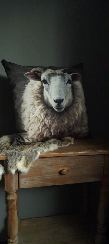Mooi zacht fluwelen kussen met een afbeelding van een schaap.