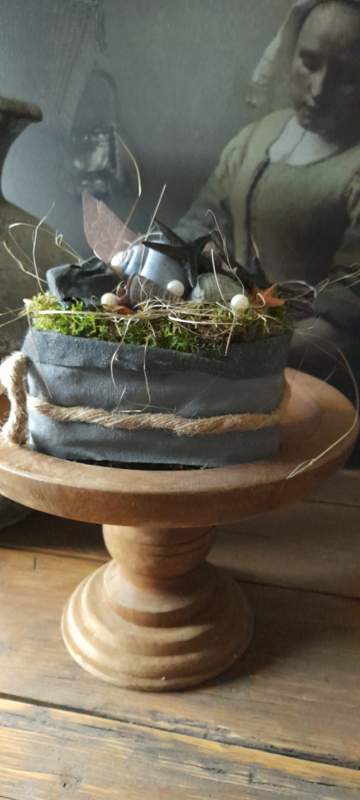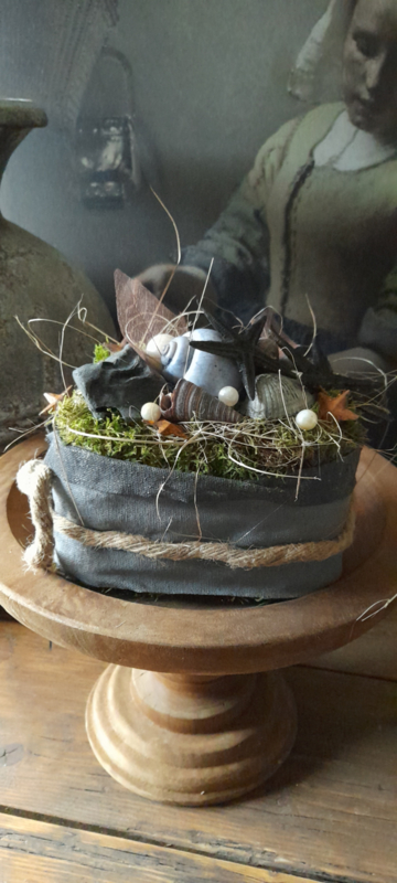 Gemaakt met mos, linnen lint, schelpen, zeesterren, parels en metalen roest sterren.