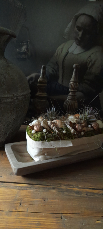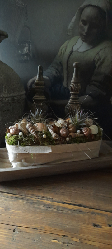Gemaakt met ,mos, zeegras, kunstgroen, schelpen, parel ,roeststerren en linnen lint.