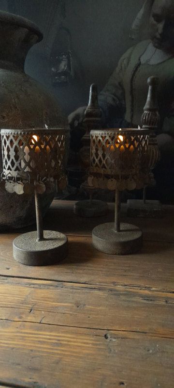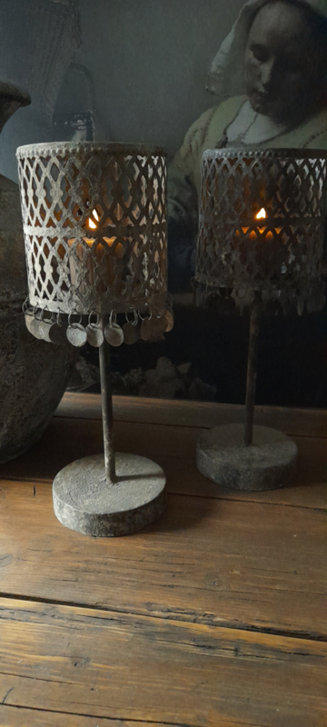 Sfeerlicht op voet klein.Stoer sfeerlichtje op voet voor waxinelichtjes.Hij is 22 cm hoog en 10 cm in doorsnede.
